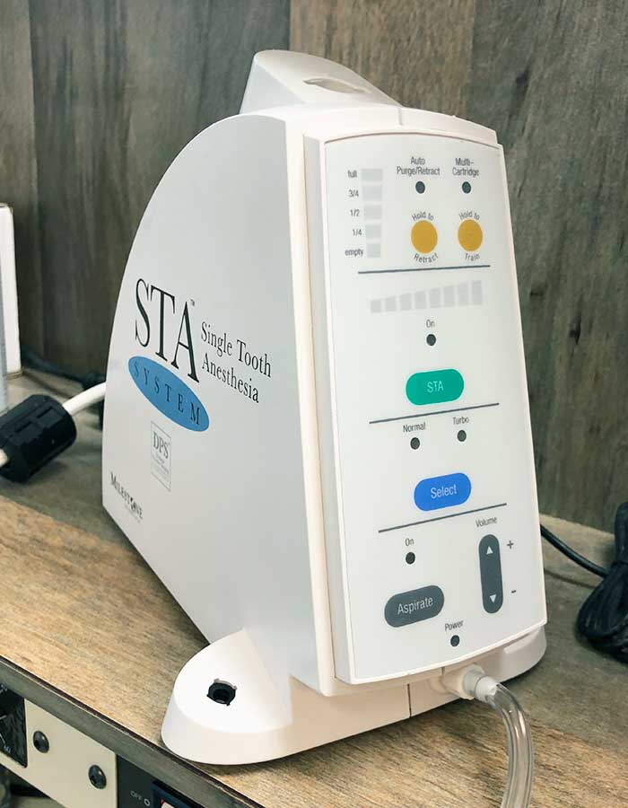 An injection device utilizing a computer delivers anesthesia to a single tooth rather a whole area. It delivers anesthetia to the patient with the precise dosage in the exact location needed, so patients won't have a numb tongue, lip or cheek and will be able to go back to work or a social event, able to speak and eat, without waiting for the anesthetic to fade away.